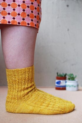 Add a sunny spring to your step with these cheerful socks. Simple ribbed socks always fit beautifully and the little cable twists add an interesting detail to the striking rib columns.