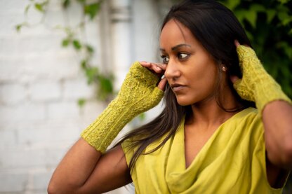 These elegant mitts are worked from bottom to top, following a mock cable chart. After hand stitches are inserted and increased (following a chart featuring a leaf motif), thumb stitches are held on waste yarn while the mitt top is completed. The thumb top is then is worked separately.