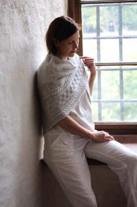 Muistojen Medaljongit – Memory Lane Shawl combines the simplicity of garter stitch with an intricate cable pattern that resembles the delicate continuity of medallions. Each knitted stitch can hold cherished memories and thoughts, hidden within the medallions—preserving their secrets while warming the wearer. This shawl is a tribute to moments that stay in our hearts forever. Create your own Memory Lane and let your shawl tell the story.