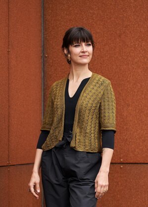 A short sleeve jacket for summer, made in silk, hence lovely to wear. The divine lace weight Jaipur Fino from BC Garn in a moss color is my choice. The lucina shell pattern gives a delicate expression perfect for the silk yarn. The cardigan is knitted in pieces and seamed for the best fit. The frontband has both a garter stitch part and a stockinette stitch part which is left to roll.