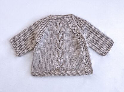 This charming unisex baby cardigan knitting pattern features a beautiful central cable motif and a decorative button band that cleverly eliminates the need for buttonholes. The design is worked flat from the top down with seamless raglan shaping, while the sleeves are knit in the round for a smooth finish. It's a delightful project for knitters who enjoy thoughtful details and a clean construction.