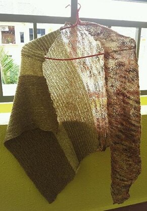 It is a side-way, asymmetrical, triangle shawl. The stitch patterns consisted alternate sections of garter and stockinette stitches. No blocking is needed so as to let the stockinette sections curl naturally. Any yarn and colours will be great for it. Gauge is not important.