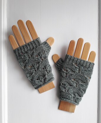 These fingerless mitts start with a stocking stitch roll and end with twisted rib. They are knitted flat and the thumbs are worked from picked up stitches along the seamed edge. Lace and garter stitch form the cute mushrooms pattern. Perfect little mitts to wear while out foraging.