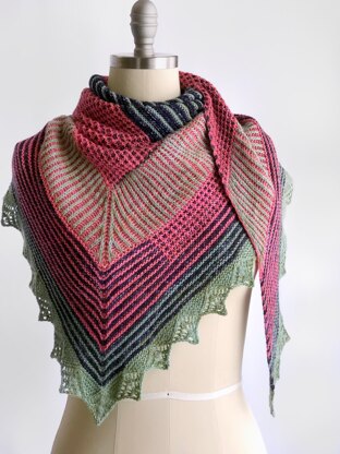 Inspired by the colorful, graphic designs of jazz and blues posters, this triangular shawl offers an opportunity to play with a variety of stitch patterns and techniques, such as garter stitch, basic brioche, mosaic knitting, and simple lace (with or without beads).