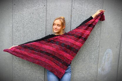Mutig is a simple striped triangular shawl that is increased on one side and primarily uses knit stitches and yarn over/decrease combinations. Sections of bold garter stitch stripes and eyelet rows are repeated in different sequences for eye catching pops of color and texture.