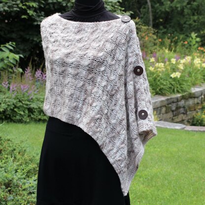 Cables wind their way sinuously up this lovely wrap, knit in Mia Bella Snug, a cushy Aran weight yarn. Knit at a loose gauge, the wrap will be large, but light—just right for slipping over one’s shoulders on a crisp autumn evening, as the breeze picks up or when the beach is too pretty to leave even though it’s getting chilly.
