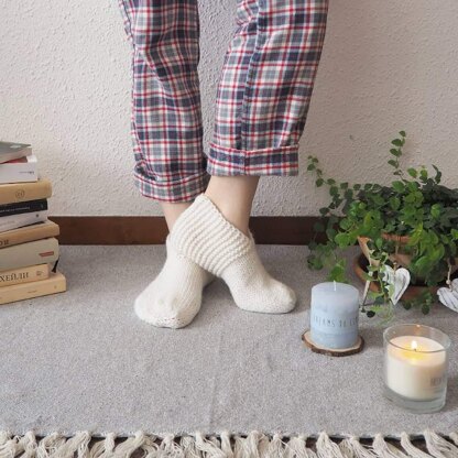 The slippers are knitted flat for the heel and then gathered in the round for the rest of the foot. There are 2 sizes available in the pattern (36-37; 38-39), but it can be easily adapted to different foot size. You may need for size 1 - 70 g worsted weight yarn. You may need for size 2 - 100 g worsted weight yarn.