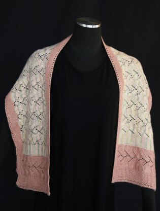 It was knit on 3.25mm needles using Eden Cottage Yarns Hayton 4-Ply in Briar Rose and Cosmos Flowerbed (1 skein each). It measures 56 in x 11 in / 142 x 28 cm.