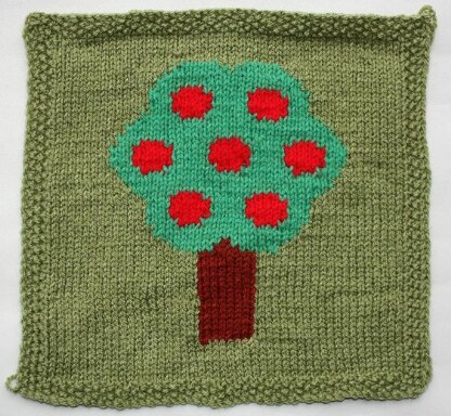 My little apple tree is the fourth in a series that makes up my Nature’s way blanket, and features an apple tree with bright red apples against a green background. It can be knitted as a square in a blanket, used as a wash cloth, or the chart can be extracted and used as a motif for jumpers and other items. When knitted in DK weight yarn, the finished square measures 10 inches (25 cm); the tree chart without the border is 31 sts by 53 rows. Both coloured and symbol charts are provided.