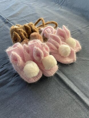 This cute shoes and mittens are made with angora. If you are going to use some other yarn, make sure that the gauge is the same. Pompom is bought at jonic-textil