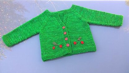 This adorable cardigan is a bottom up design with a moss stitch border. The cute little cherries are knitted into the sweater to create a 3D motif. The long sleeves are added in with raglan decreases and the button-up option will keep your little one warm.
