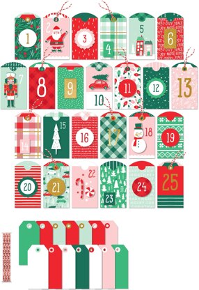Decorate for the holidays with this advent calendar kit! This 5.75x5.5x1 inch package contains 25 tags with pockets, 16 die-cuts with gold foil accents, eight chipboard elements, 17 stickers with gold foil accents, 8 yards of baker's twine and 25 gold paper clips. Imported.