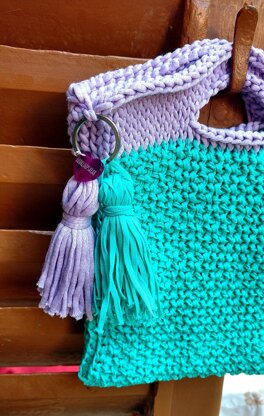 MATERIALS • 5.4 oz (155 g) of Medium to Bulky ribbon yarn (yarn A, colour teal) and soft tubular cotton yarn (yarn B, mauve – a small percentage) • Tunisian hook, cabled: J10 (6 mm) • A piece of 4” (10 cm) wide cardboard or similar flat and rigid template to create the tassels • 1 small metal ring (as for a key ring) • Removable Strap with snap-hooks (optional) STITCHES USED • Tunisian Honeycomb Stitch, worked flat • Tunisian Knit Stitch (tks), worked flat • Single Crochet, Slip Stitch GAUGE • 4” x 4” = 16 sts x 13 rows worked in Tunisian Honeycomb Stitch DIMENSIONS • 8.6” wide x 9.8” high, about 0.7” thick (22 x 25 x 2 cm) SKILL LEVEL: Beginner-friendly. TYPE OF PATTERN: written instructions + many pictures included + links to videos.