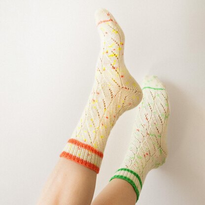 My Tennis Lesson Socks are designed with the cuff-down method with a contrasting colour. The subtle mock cable lace pattern gives a classic feeling while the sporting green stripes make a modern twist.