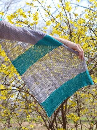 Mykonos Wrap features sections of brightly colored garter stitch bands alternating with larger sections of lace, which is knit in a second color. Don’t let the lace sections put you off, though. It is a very simple lace stitch that even a beginner can handle. The combination of lace and bold garter stripes bring to mind images of relaxing, balmy summer evenings. This is fun and easy to knit and a staple for your summer wardrobe.