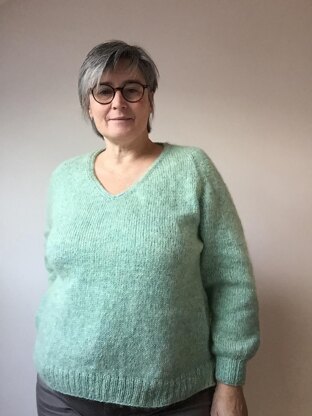 V neck sweater, with large raglan sleeves. Design to be comfortable, knit in the round topdown. Split ribs longer on the back, Icord finition on the neck. Very easy pattern, this yarn combo allows a very warm and soft knitting.