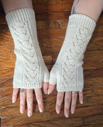 Mitaines tricotées en rond, élégantes et féminines, avec un joli motif de dentelle sur le dessus de la main. Le patron comprend 4 tailles (XS à L) et des explications détaillées rang par rang ainsi que le diagramme du point.