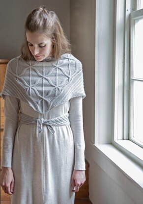 Description Knit from the point up, this shallow and wide triangular shawl is written in two sizes. The smaller size (shown in the oatmeal color) works well as a shoulder warmer or worn as a bandana. The slightly larger size (in grey) can be worn wrapped around the body and tied or folded around the shoulders and neck like a cowl.