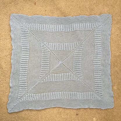 The original iteration of this blanket was created as a baptismal blanket for a baby who was baptized in our former church several years ago. The blanket construction begins in the center of the blanket and moves outward, just as a new baby is born as the center of his/her own universe and, growing, moves outward into the world at large. The name is in honor of all the Nanas, Grandmas, Grannies, Gigis, Yayas, Ammas, and all of the biological or surrogate grandparents who love to create warm snuggly blankets for their beloved grandchildren.