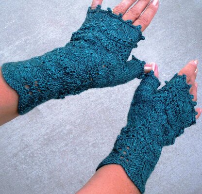 The mittens start with a few rows of garter stitch for firmness, then continue in the lace stitch, ending with a picot bind-off at the top. The palm features a panel in 1x1 ribbing, to ensure a snug fit.