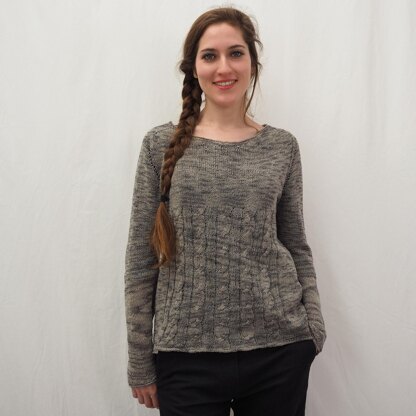 NAOKO is worked in rounds seamlessly from the top down. Neckband, hem band and sleeve cuffs are worked in a small k2,p2 ribbing with a stockinette edge. The neckline is shaped with german short rows technique. This pattern uses the contiguous method to form the shoulder yokes.