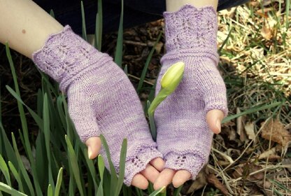 As the first fall chill hits the air, keep your hands warm with these delicate mitts. Simple stockinette adorned with lace, top and bottom, for an airy feel, and knit in fingering weight wool for a light layer.