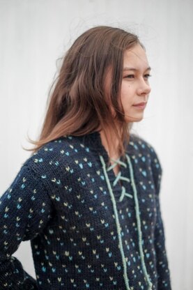 An old school Maine Wool sweater, the kind we wear year round in all seasons. For winter hauling wood through to summer evenings on the lobster boat. Nash Island is knit old school too, entirely flat, with the color work "lice" happening only on the right side to make it easy.Modified drop shoulder with a lace up placket.