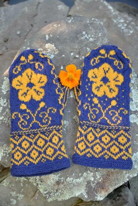Nasturtium is a cheerful color work mitten, with a wide cuff, a two-color Estonian braid and flower motif main design, plus a matching headband! It is worked in the round entirely from charts and has a Norwegian style thumb that forms on one side of the mitten palm. The thumb gusset is flanked by two columns of contrast color stitches. Stitch markers will help separate the growing gusset from the rest of the mitten pattern. All gusset increases occur inside the two columns of contrast color stitches. Reserve the thumb gusset stitches onto scrap yarn to better permit the mitten to be tried on for size and fit.
