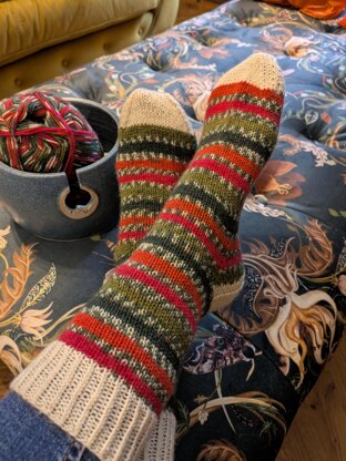 This is a cuff down sock worked in the round using the Holly Berry and Cream colourways. Although I’ve used a set of Addi 20cm/3mm needles if your preference is to use DPNs or the magic loop method these will work perfectly as well.
