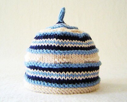 This simple striped cap has a nautical flair. It is knit in the round using simple knit and purl stitches with an i-cord topper.