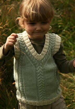 This pattern is for a child's vest. It has a cable that runs up the center of the front before splitting either side of the v-neck and then joining another cable at the shoulders. Two cables run up the back to meet the front cables at the shoulders.