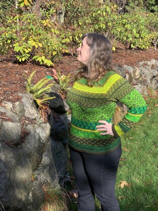 Materials: 11 colors (9 green, 2 yellow) 100% pure Rohrspatz und Wollmeise birdies (fingering weight merino wool) yarn - pattern requires approximately 1585-1800 yards.