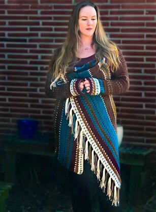The inspiration for this pattern was to challenge myself and to create a cozy warm PLUS sized cardigan that looked kinda hippy, but could also dress up nice too.