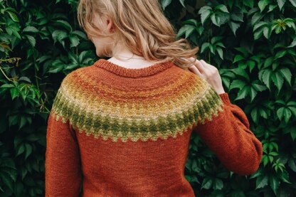 Navran is a top-down seamless yoke sweater that is knit in the round. There is a double folded ribbed neckline followed by short rows at the back of the neck for a comfortable fit. The yoke features stranded, textured colourwork that has been designed in the Bohus stickning tradition. There is optional waist and hip shaping to add feminine shape, and the hem and wrist cuffs are finished off with ribbing. Navran is slightly cropped at the waist.