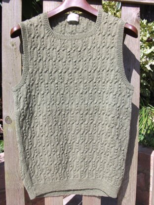 A neat fitting, versatile to wear tank top. The medallion stitch pattern looks complicated but is really quite simple. The twist stitch pattern looks like cabling but isn’t and all wrong-side rows follow the knit and purl stitches of the previous row. A lovely tank easily worn by men or women.