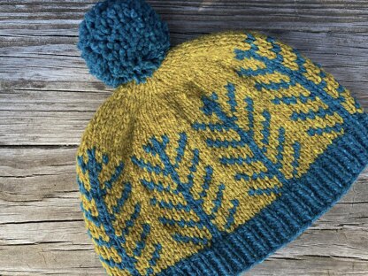 Yarn: Green Mountain Spinnery Weekend Wool (worsted weight/ 140 yds per skein), 1 skein each in “Pine Warbler” (CC) and “Teal” (MC)