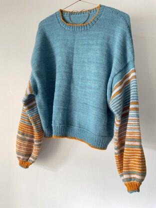 This is a drop shoulder boxy pullover worked from the bottom up and in the round to the underarms. The back and front are then worked flat and shoulder stitches are cast off using the 3-needle bind off. The sleeve stitches are then picked up and worked down in the round to a gathered cuff. Finally, stitches are picked up around the neck for a shallow neckband. The body of the pullover is worked in one colour, with contrast colour used as trim at the neck and hem. The sleeves are worked in stripes with three colours.