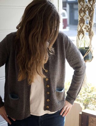 This is a classic design for a v-neck cardigan with set-in sleeves and contrast color pockets. Knitting the sweater with Cloudborn’s fingering weight twisted wool creates a lightweight, but cozy cardigan, great for layering and when you want something warm without a lot of bulk. This pattern does employ some short-row shaping for the neck and shoulders, and it is knit from the top down. The button band that travels all the way around the sweater boasts an i-cord bind-off for a professional finish.