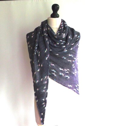 This sideways knit triangle, with right hand side increases, uses the assigned pooling method to create a striking garment.