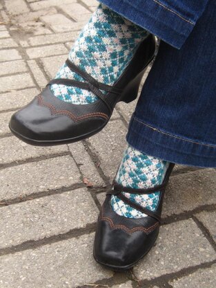 This is a cuff-down pattern with a flap heel and wedge toe. Cuff, heel, and toe are worked in Main Colour and colour-work pattern (argyle motif) is worked in MC and one CC. Instructions provided for both Magic Loop and DPN methods. Recommended that knitters have some experience with sock knitting and with stranded colour-work