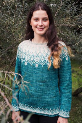 Neretina is a top-down seamless yoke sweater that is knit in the round. The neckline features a Latvian braid, and is followed by short rows at the back of the neck for a comfortable fit. The yoke has stranded colourwork inspired by Latvian patterns. There is optional waist and hip shaping to add feminine shape, and the wrist cuffs and hem are finished off with echoing elements of the yoke design and Latvian braids.