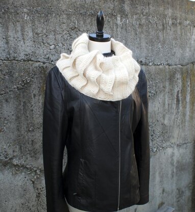 The nesting cowl has a beautiful continuous flow of ruffles all along its length. Simple stitches combine to make visually interesting and textural elegant ruffles. Whether worn wide or doubled up for a skinny effect, this cowl is sure to turn heads.