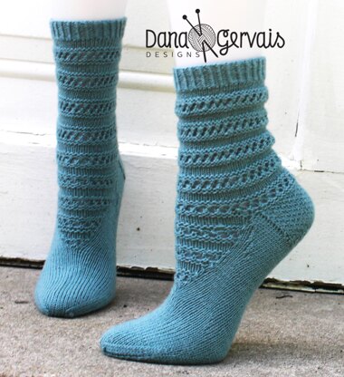 Neta is worked from the cuff down and features an easy to memorize stitch pattern on the front and back of the leg. This pattern features an Eye Of Partridge heel flap, and arch shaping through the gusset and instep stiches. The stitch pattern continues on the top of the foot until the pattern stitches are consumed and replaced by stockinette stitches. The sock ends with a wedge toe that is grafted closed using Kitchener stitch.