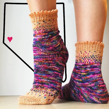 Nevada is a party in the middle of a desert! This sock is worked toe-up, with a simple colorwork pattern to highlight Nevada’s beautiful deserts and its sparkly, showy Las Vegas.
