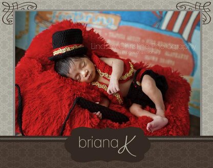 Includes the following: Instructions for the Top Hat, Jacket, Diaper Cover, Bow Tie and Whip. Sizes: Newborn Materials needed are included in the pattern.