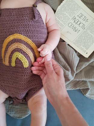 Rainbow Romper is a comfy onesie for newborns worked top down seamlessly. Buttons are sewn to the gusset and top, what makes easier to put on / take off the romper and change the diaper quickly. Front body is decorated with a fancy “rainbow” appliqué.