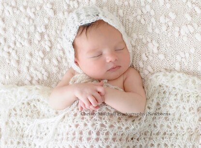 This crochet pattern comes with complete instructions for this very elegant and lacy scallop and cables bonnet and coordinating wrap. The bonnet has ties that can be tied under the chin. The bonnet is made in a very open and lacy stitch to add a delicate look to it. The wrap is made with the same stitches and is large enough to use as a cover or to wrap the newborn in it. The bonnet is for newborns only. I used a mohair yarn, you can use any yarn as long as it is #2 weight and you match the gauge.