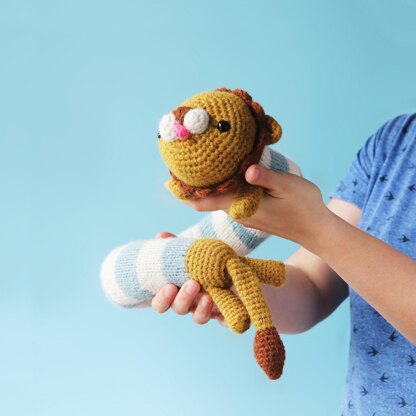 Nicco The Lion is quite the acrobat! Twist and knot the long stripy body and see what shapes he can make - this project makes a fun toy for the little ones or a cosy neck warmer for the grown-ups. Combining crochet details with a long knitted body tube creates a nice contrast in texture, the knit section adds extra flexibility to the body. There is also an option for an all-crochet body in centre single crochet stitch (csc) that gives a firmer fabric with a knit-like look! The instructions are written in US crochet terms and standard knitting terms for the knit option on the body. There are step by step photos detailing how to make the pieces and finish the toy. When made with Aran weight yarn (sample made in Drops Sky held double) and 4.50mm hook the finished lion will measure about 78cm/30in long, adjust the length as you prefer when making the body.