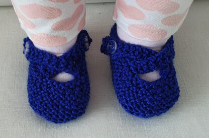 These baby shoes are knitted in easy garter stitch and have two crossed and buttoned straps.