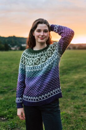 Nidelva is a top-down seamless yoke sweater that is knit in the round. There is a double ribbed neckline with integrated increases, followed by short rows at the back of the neck for a comfortable fit. The yoke features stranded colourwork that has been inspired by Norwegian motifs. There is a full body little dot pattern, and the hem and cuffs are finished off with colourwork that reflects elements of the yoke pattern, and double ribbing. There is optional waist and hip shaping to add feminine shape.